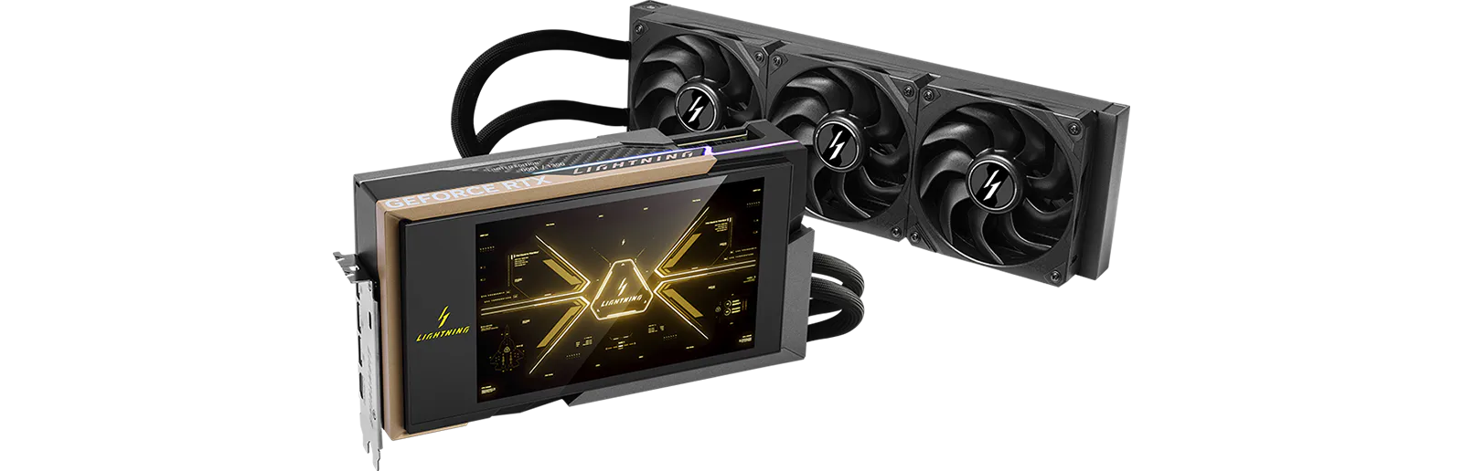 Unlike most partner cards, the Lightning Z ships with a fully integrated 360 mm AIO liquid cooling solution. Precision-engineered waterways cover the GPU die, VRAM, and MOSFETs simultaneously, ensuring uncompromised thermal performance at any power level. The result: even when drawing up to 800W in its default OC Mode, the card runs cool and quiet. Connector temperatures on both 12V-2x6 plugs remain around 42°C under full load — well within safe limits — thanks to the load being distributed evenly across two connectors, each handling approximately 500W. This is 100W less per connector than a standard RTX 5090 pushing through a single plug. Note that the AIO cooling system requires a case with an appropriate 360 mm radiator mount. The remote radiator also allows you to direct hot exhaust directly out of the case, rather than back over your CPU and RAM.